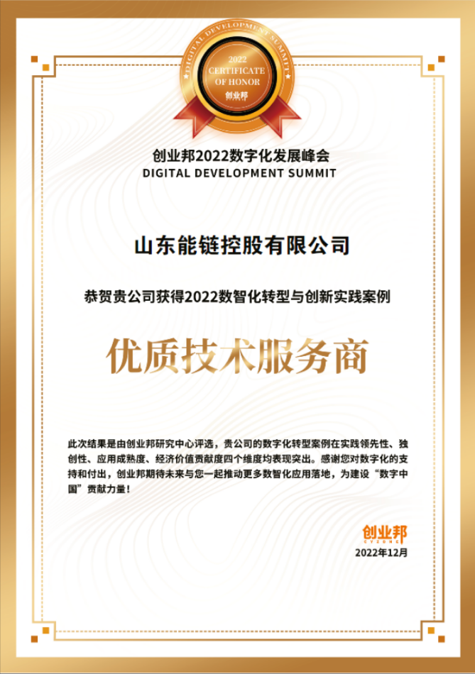 基于上述实践的领先性、独创性、应用成熟度、经济价值贡献度等,创业邦研究中心授予能链2022数智化转型与创新实践案例“优质技术服务商”称号。